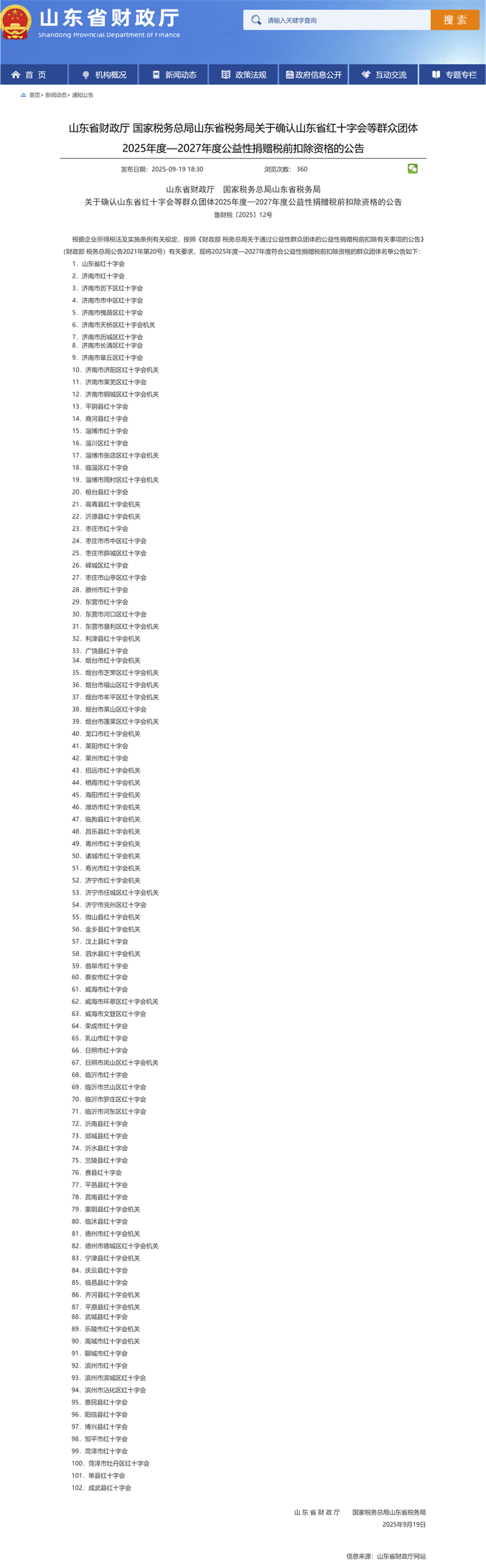 山东省财政厅 国家税务总局山东省税务局关于确认山东省红十字会等群众团体2025年度—2027年度公益性捐赠税前扣除资格的公告