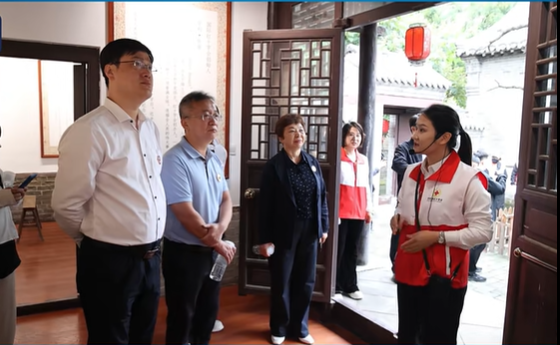 9月27日,中国红十字应急救援综合演练北部协作区领导到无棣县调研时,吴重憙红十字文化志愿服务队志愿者 向领导们讲解无棣古城红十字救护站。