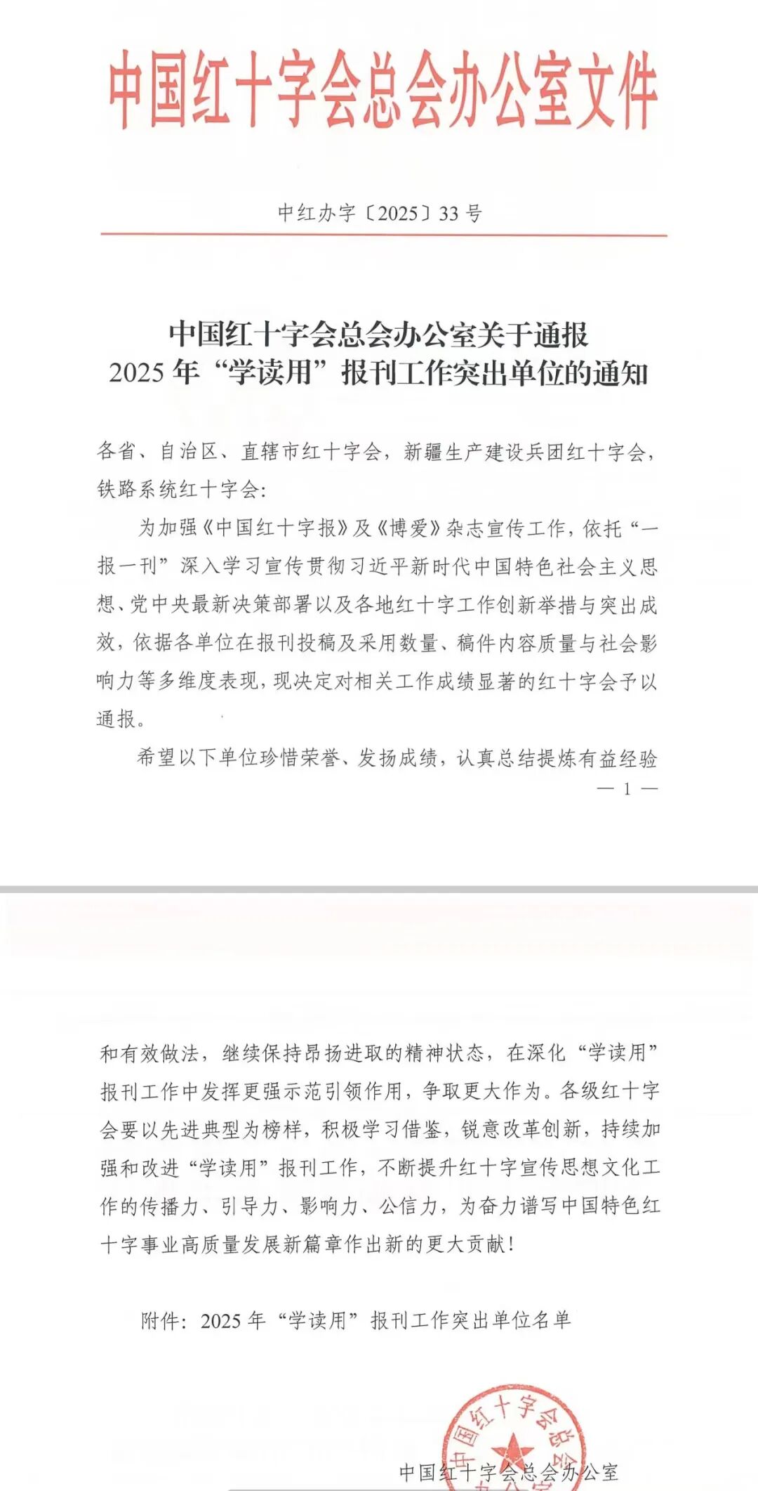 近期,中国红十字会总会办公室印发《关于通报2025年“学读用”报刊工作突出单位的通知》(中红办字[2025]33号)。
