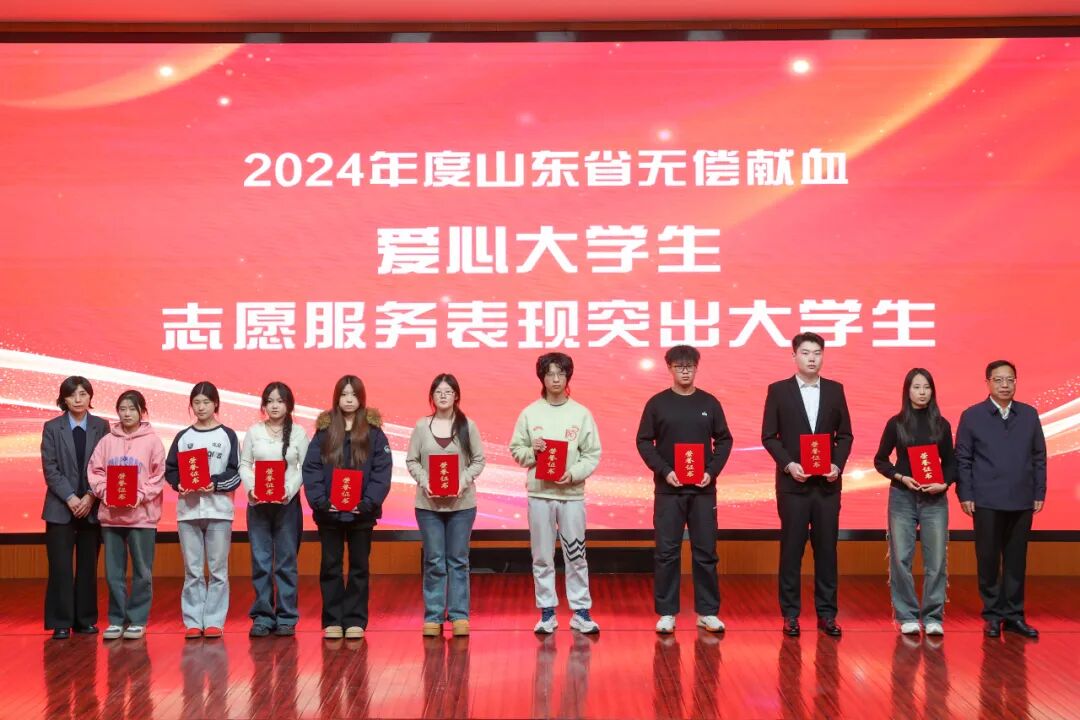省红十字会医学捐献服务中心主任刘文罗等领导为荣获2024年度山东省高等院校无偿献血奖项的个人和集体颁奖